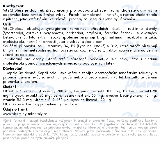 VitaCholess je doplněk stravy určený pro podporu zdravé hladiny cholesterolu v krvi a celkového kardiovaskulárního zdraví. Působí komplexně – ovlivňuje tvorbu cholesterolu v játrech, jeho vstřebávání ve střevě i procesy související s jeho vylučováním.Použití