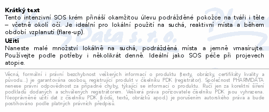 Tento intenzivní SOS krém přináší okamžitou úlevu podrážděné pokožce na tváři i těle – včetně okolí očí. Je ideální pro lokální použití na suchá, reaktivní místa a během období vzplanutí (flare-up).Použití