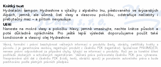 Hydratační šampon Hydrashine s výtažky z alpského lnu, pěstovaného ve švýcarských Alpách, jemně, ale účinně čistí vlasy a vlasovou pokožku, odstraňuje nečistoty i přebytečný maz – a přitom nevysušuje.Použití