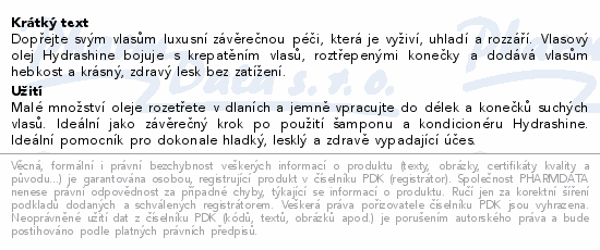 Dopřejte svým vlasům luxusní závěrečnou péči, která je vyživí, uhladí a rozzáří. Vlasový olej Hydrashine bojuje s krepatěním vlasů, roztřepenými konečky a dodává vlasům hebkost a krásný, zdravý lesk bez zatížení.Použití