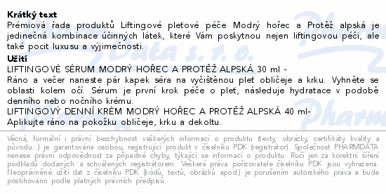 Prémiová řada produktů Liftingové pleťové péče Modrý hořec a Protěž alpská je jedinečná kombinace účinných látek, které Vám poskytnou nejen liftingovou péči, ale také pocit luxusu a výjimečnosti.Použití