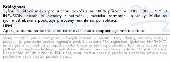 Vyživující tělové mléko pro suchou pokožku se 100% přírodním SKIN FOOD PHYTO INFUSION, obsahující extrakty z heřmánku, měsíčku, rozmarýnu a violky. Mléko se rychle vstřebává a poskytuje přirozený lesk ihned po aplikaci.Použití