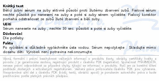 Bělící zubní sérum na zuby aktivně působí proti žlutému zbarvení zubů. Fialové sérum nechte působit po nanesení na zuby a poté si zuby sérem vyčistěte. Fialový korektor pomahá odstraňovat ze zubů žluté zbarvení a bělí zuby.Použití